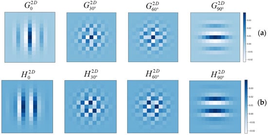 In the general form of the 2D Gabor filter in Equation (1), i is the unit imaginary number, x and y are the independent spatial variables, λ represents the wavelength of the sinusoid, θ specifies the orientation of the parallel stripes of the Gabor kernels, ψ is the phase offset, σ is the standard deviation of the Gaussian function modulating the sinusoid, γ is the spatial aspect ratio that determines the ellipticity of the Gabor kernels, , and . For simplicity, the 2D Gabor filter can also be expressed as a real part and an imaginary part, i.e., and . As an example, the real and imaginary pairs for 2D Gabor filters in four varying orientations are shown in Figure 3.