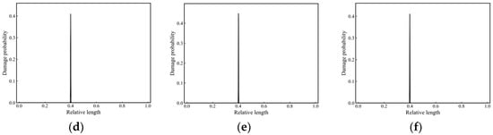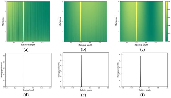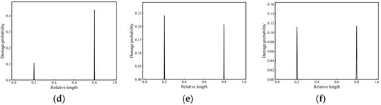 In the simulated scenario with an SNR of 90 dB, Figure 9a–c illustrates the MS-LIE at various scales obtained from the first, second, and third mode shapes, respectively, where the multi-scale space is established on the scale range of 2–10 and a step size of 0.1. The corresponding damage detection results are presented in Figure 9d–f. The presence of multiple damage does not affect the sharp change in the amplitude of the MS-LIE at each damage location, and the MS-LIE heat map of the higher order mode shape is smoother and more robust to noise. Using the proposed data fusion technique, the precise locations of both damages are determined correctly at the peaks of the final damage probability distribution.