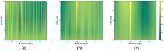 For this experiment, we similarly select 1000 pixels along the beam’s length as virtual sensors to capture high-spatial-resolution mode shapes. The results of the MS-LIE are presented in Figure 25a,c,e, where the Gaussian multi-scale space is established by the scale range of 2–10 with the step 0.1. Enlarged heatmaps corresponding to the larger scales are displayed in Figure 25b,d,f. The behavior of the damage representation in the multiple damage scenario closely resembles that in the single damage case. With the aid of the proposed data fusion algorithm, the advantage of high localization sensitivity at small scales and the advantage of strong noise robustness at large scales are fully integrated. The final damage localization results using the first, second, and third mode shapes are presented in Figure 26a–c, showcasing the proposed method’s ability to clearly reveal multiple damages and achieve precise localization.