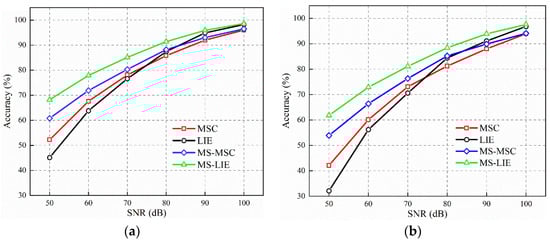 Monte Carlo experiments are performed to statistically compare the detection accuracy of the methods. Considering the trade-off between simulation accuracy and computational resource consumption, a convergence analysis has been performed and the results tend to stabilize after the sample size reached 2000, suggesting that this sample size is sufficient for this specific case. Therefore, the Monte Carlo sample size is set to 2000, adhering to Chebyshev’s law. A broad range of SNRs (50 dB–100 dB) is considered with the damage degree maintained at a constant level (). Two damage cases are studied: single damage and multiple damages (with 2 to 4 damages at random). The results are presented in Figure 13, which demonstrate that the proposed method has better noise immunity compared to the other two methods, especially in the cases with multiple damages.