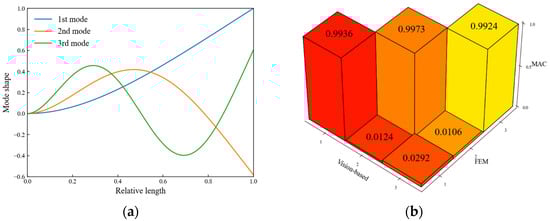 A high correlation between the two mode shapes is indicated by a MAC value close to 1. The bar chart in Figure 19b depicts the MAC values for the first three mode shapes, validating the strong correspondence between the mode shapes obtained from the vision-based system and those from the FEM. This means that the high-spatial-resolution mode shapes given by vision-based method are reliable.