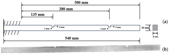 For the detection of multiple damages, the experiment is performed on an aluminum alloy 6061 beam specimen featuring two open cracks. The two cracks are introduced into the specimen via wire-electrode cutting, with the length of 3 mm, 4 mm and the depth of 4 mm, 5 mm. The specimen’s dimensions and the cracks’ location are displayed in Figure 24a, and an image of the employed specimen is provided in Figure 24b.