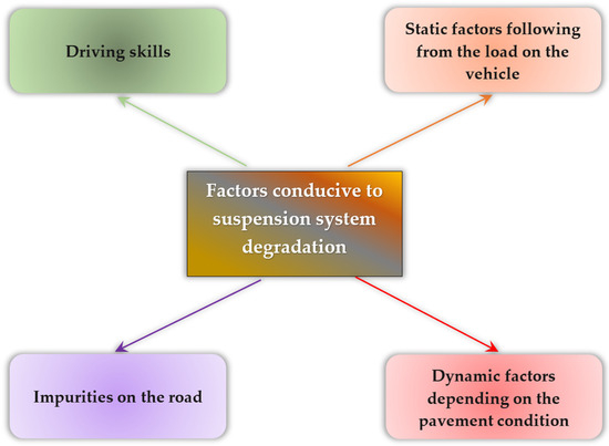 The suspension system is one of the vehicle systems most vulnerable to damage and even premature wear. This stems from operational conditions during use. A summary of factors conducive to the destruction of vehicle suspension system components is presented in Figure 1.
