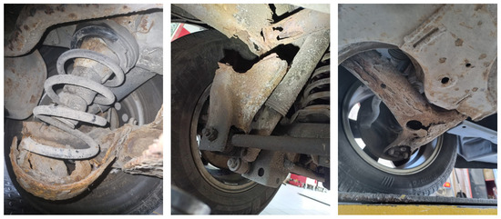 When pointing out the factors that affect the life of the suspension system, it is necessary to mention impurities on the road, which include small stones, road salt, or other chemical compounds that reduce roadway slipperiness [21]. At this point, it should be mentioned that water may be present on the roadway after precipitation. Water penetrating into the suspension system may accelerate the degradation of the various components [22].
