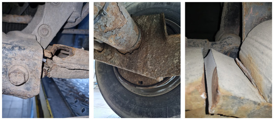 The most common form of degradation of metal suspension components is corrosion. That phenomenon is easy to diagnose during vehicle inspections as it is not necessary to dismantle the various components to identify corrosion centres. Figure 3 shows examples of extreme damage to a suspension system with visible corrosion centres, as well as an example of fatigue cracking in one of the system components. All that damage was diagnosed during a periodic vehicle inspection at a diagnostic station. If the vehicles had not been near the expiry of their road worthiness approval, the drivers would probably not have come to the diagnostic station and they would have continued to operate their vehicles. The consequences of vehicle operation in such a technical condition could be tragic. The computer simulation carried out further in this article will be the best example to illustrate the effects of the operation of a vehicle in which the deterioration processes of the suspension system components were taking place. The driver may have been unaware of the vehicle’s condition, which led to fatigue wear and the left front wheel having been torn away, resulting in a road incident.