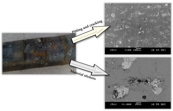 In addition to corrosion noted on vehicle suspension system components, wear of a tribological nature is also noticed [24]. However, this is difficult to identify because it occurs at the interface between the components. To identify such wear, it would be necessary to disassemble the system and submit it to observations. Due to the time-consuming and complicated nature of the process, however, it is customary not to disassemble the suspension system during operation without a clear indication to do so. The technical inspection procedure at diagnostic stations does not provide for such disassembly, either. Unintentional neglect of issues related to tribological wear may lead to unserviceability, an example of which is shown in Figure 4.