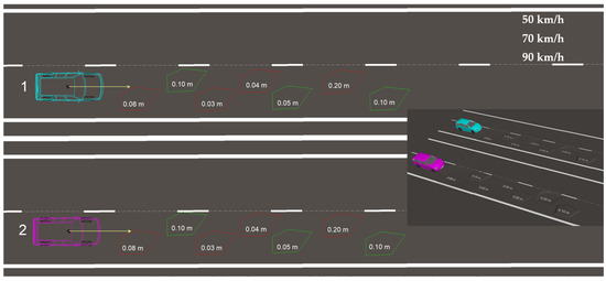 The second example analysed in this article concerns a collision between two cars, this time both travelling at 70 km/h. The scenario before the road incident is the same as in the previous case. Figure 15 and Figure 16 show the visualisation and location sketch of the traffic participants after the head-on collision.