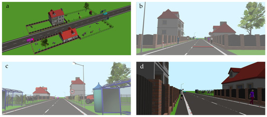 A sample traffic zone in a built-up area: (a) the general view, (b) the view from the position of the driver of the car with the damaged suspension system, (c) the view from the position of the driver of the car moving correctly, (d) the view through the eyes of one of the pedestrians.