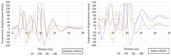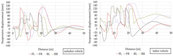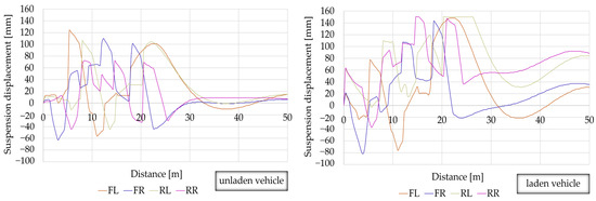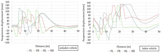 The simulation of the influence of road irregularities on the change in the displacement of suspension system components was simulated using the V-SIM 5.0 computer software. That is a programme enabling, in compliance with the principles of dynamics, the analysis of the vehicle movement and behaviour, the simulation of collisions as well as the analysis of the pedestrian’s and driver’s behaviour. In addition, the programme enables the reconstruction of different road incident scenarios, taking into account complex interactions in the human–vehicle environment system.