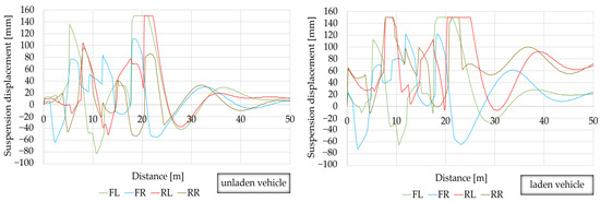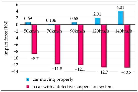 Driving skills also influence the technical condition of the suspension system [23]. Speed selection and the skills related to overcoming obstacles etc. have a significant influence on the operation of the suspension system. The vehicle driver should react to changing road conditions, ruts, or cavities in the pavement early enough. The lack of the driver’s reaction, such as speed reduction, or indiscriminate driving into the cavities in the pavement, has considerable influence on the possible damage to the suspension system components. Vehicle overloading is a frequent, yet unacceptable practice. Sometimes, especially in the case of trucks or delivery vans, drivers cause vehicles to overload to save time. Such situations may also be categorised as factors conducive to the destruction of the suspension system.