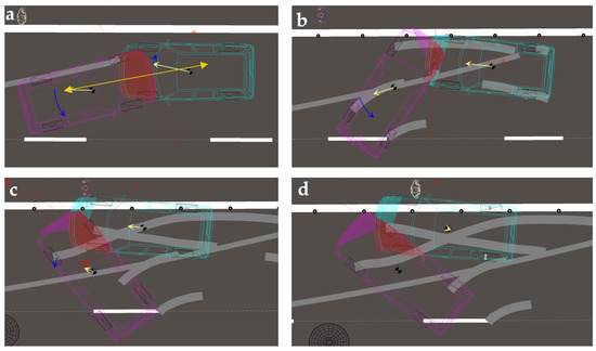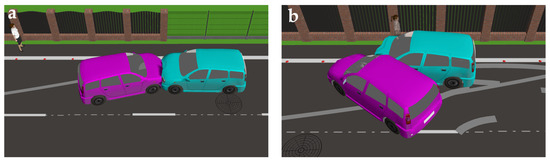 The visualisation of the road accident resulting from damage to the suspension system in one of the cars; the speed of both being 70 km/h; (a) at the initial point of the accident; (b) moment the vehicles stopped.