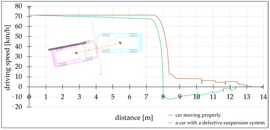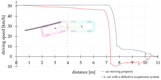 It has been pointed out many times in the previous items that any unexpected damage to the suspension system may lead to a road incident. An example of that fact may be seen in the simulation conducted in this chapter. The simulation shows how dangerous the consequences may be when the control of the car is lost. In the first instance, a scenario was assumed where cars were travelling at 50 km/h and there were pedestrians on the road shoulder. Figure 12 and Figure 13 present the visualisation and a location sketch of the road incident. During the moment when the suspension system was damaged, there was an abrupt lane change and a head-on collision with an oncoming car.