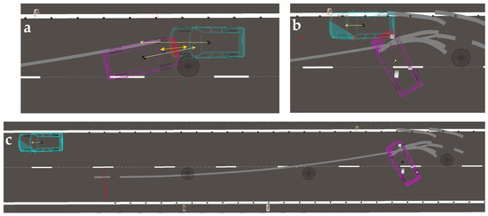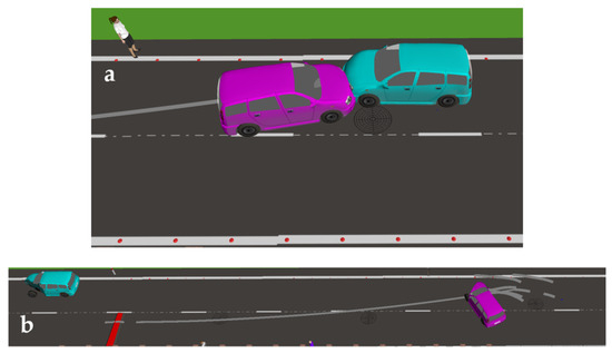 The visualisation of the road accident resulting from damage to the suspension system in one of the cars; (a) the road situation at the initial point of the accident; (b) the road situation at the point the vehicles stopped.