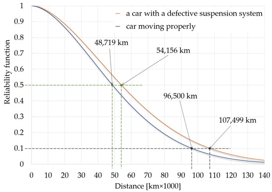 The car moving correctly, i.e., the fully loaded one, achieves a fifty per cent probability of correct operation as early as at the mileage of 48,719 km. The car with the damaged suspension system, i.e., the one in which only the driver was present, reaches the same probability level only after it has travelled 54,156 km. The components most susceptible to damage, i.e., the rubber components in the suspension system, are mainly responsible for achieving such values.
