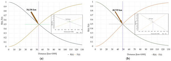 The expected correct operation time [28] is one of the major reliability indicators. In this article, the value of the operation time median was determined graphically, following the previous collation of the cumulative distribution function and reliability function . The indicator may be determined analytically using Formula (6) [29].