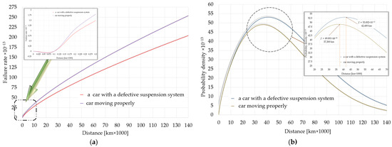 The shape parameter α for both cars under analysis has a value above one; therefore the damage intensity function in each case will be an increasing function. This means that the probability of failure rate will increase over time [30]. This is confirmed by the suspension system damage intensity diagrams presented in Figure 21a. It follows from those that the run-in period for the system components of both cars will end after the mileage exceeds approximately 11,000 km. It is also important to note that, for the car moving correctly, that process will be slightly accelerated and will end at approximately 10,500 km. Any damage occurring during that period may not only be due to the car’s operating conditions, but may also be due to the smoothing and matching of the interfacing components.