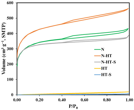 N2 adsorption isotherms of N, N-HT, N-HT-S, HT, and HT-S.