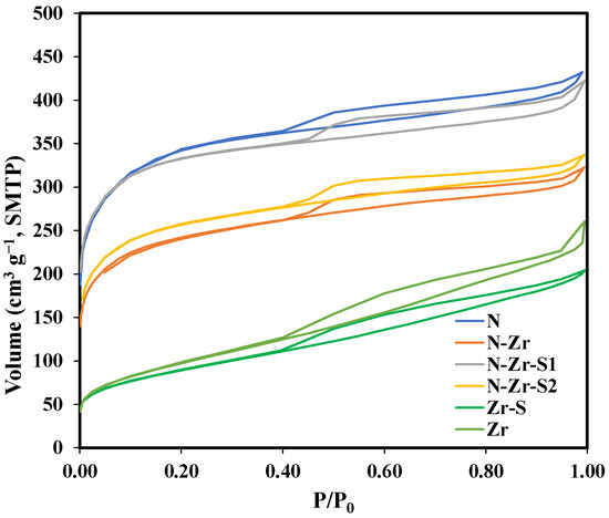 The behavior is different for those carbons constituted by zirconia (Figure S1). The deposition of zirconia on Norit (N-Zr) hampers the access of N2 into the pores, probably due to their blockage, thereby reducing the porosity of this material. Treatment with diluted sulfuric acid (N-Zr-S2) promotes the lixiviation of this mineral, resulting in a higher porosity. This effect is even more significant when concentrated sulfuric acid is used (N-Zr-S1) since a higher amount of ZrO2 is lixiviated from the solid. Zr and Zr-S also show type IV adsorption isotherms with a lower proportion of micropores. Furthermore, the higher slope of the curves in the middle range of pressure values suggests that the volume of mesopores is larger for Zr and Zr-S compared to the carbonaceous materials grafted with zirconia.