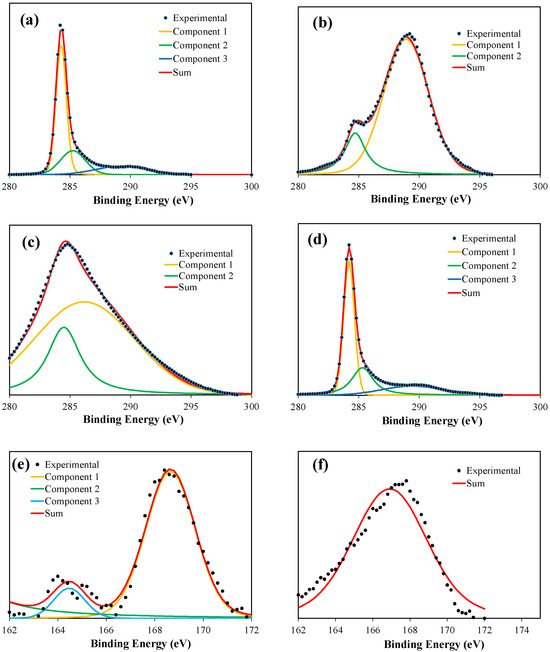 XPS spectra: (a) N-HT (C 1s); (b) HT (C 1s); (c) HT-S (C 1s); (d) N-HT-S (C 1s); (e) N-HT-S (S 2p); (f) HT-S (S 2p).