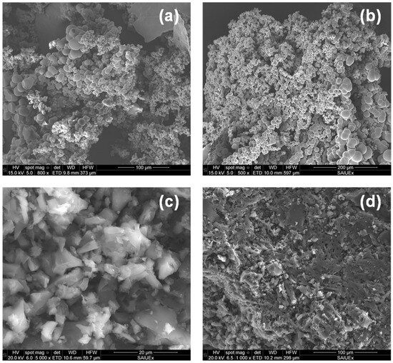 Figure 5a,b shows the typical spheric morphology of hydrothermal carbons prepared from carbohydrates, with different sphere sizes for both catalysts [34]. Moreover, chemical treatment with sulfuric acid does not alter the characteristic morphology of this material. Nor does it induce any significant change in particle size. Nevertheless, catalysts N-HT and N-HT-S show both an irregular morphological pattern with a lack of spheres (Figure 5c,d), thereby pointing to a modification of the surface of the catalyst without producing an activated carbon/hydrothermal carbon composite.