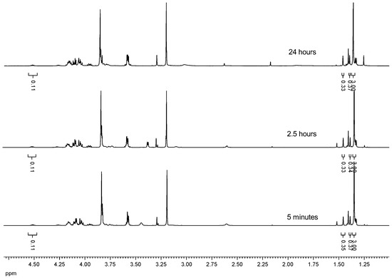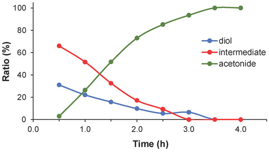 We also performed a kinetic NMR study for the reaction of diol 10 catalyzed by HT-S at 40 °C (Scheme 2, Figure 9). The reaction progresses rapidly as diol 10 and intermediate I10-12 are consumed, thereby forming acetonide 12 quantitatively in less than 4 h. First-order rate constants of 1.004 h−1 and 0.709 h−1 were determined for the first and second step, respectively, with half-life times of 0.7 and 1.0 h for diol and intermediate (Figure S17).