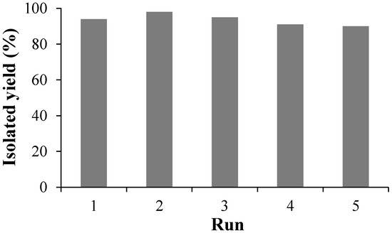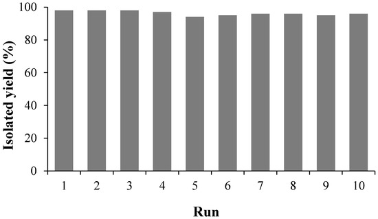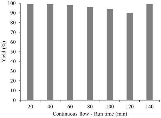 These experiments evidence that the reaction catalyzed by N-HT-S proceeds with excellent yields after five runs, with identical reaction times in the first three runs. Remarkably, hydrothermal catalyst HT-S could be reused up to 10 times, maintaining excellent yields in all runs (>94%). Furthermore, reaction times were significantly shorter. These results show the potential of this catalyst for flow chemistry, as we shall describe later.