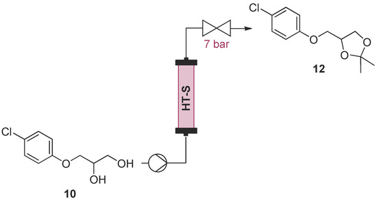 A 0.20 M solution of 3-(4-chlorophenoxy)propane-1,2-diol in 2,2-dimethoxypropane, prepared in a volumetric flask, was pumped using a syringe pump (Infusetek CFSP-I) into a packed bed reactor containing 353 mg of HT-S with a flow rate of 1.246 mL/min (30 s contact time with the catalyst bed). The system was pressurized to 7 bar using a backpressure regulator (Upchurch Scientific, Washington, DC, USA) to stabilize the system. Under steady-state conditions, the liquid stream was collected from the reactor output for 60 min. The crude mixture was evaporated under reduced pressure, resulting in 3.447 g (14.2 mmol, 95% yield) of the title compound. Spectroscopic data matched the values reported in Section 2.4.2).