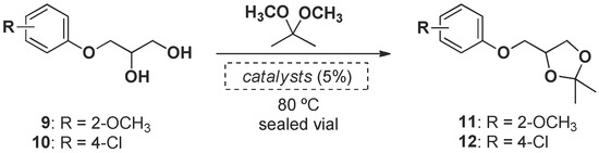 Firstly, we investigated the acetalization of two model diols (9 and 10) against a wide variety of heterogeneous catalysts (Scheme 1). These reactions were performed under magnetic stirring at 80 °C in a sealed vial to minimize the evaporation of the solvent and to avoid the presence of moisture in the reaction media. The catalysts employed in this screening are listed above (Table 1). Catalyst load and acetalization reagent were optimized in a previous study [12]. Reactions were monitored by TLC analysis until the complete consumption of starting materials. Purification by column chromatography was only required when analysis of the crude reaction mixtures by 1H-NMR showed the presence of impurities. Table 7 summarizes the results of this catalytic screening.