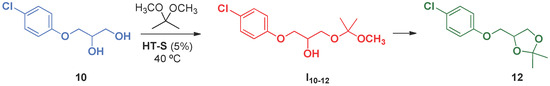A mixture of 3-(4-chlorophenoxy)propane-1,2-diol (0.5071 g, 2.50 mmol), the catalyst HT-S (0.0249 g), and 2,2-dimethoxypropane (5 mL) was placed in a sealed vial at 80 °C under stirring. After 20 min, the catalyst was filtered through a glass microfiber filter with a nylon membrane of 0.22 μm, and the resulting filtrate was concentrated under reduced pressure to give acetonide 12 as a white crystalline solid (0.5664 g, 2.33 mmol, 93%). M.p. 42–43 °C. IR (ATR) ῡmax 1596, 1581, 1490, 1451 (arom), 1203, 1169, 1152, 1051 (C-O-C) cm−1. 1H-NMR (500 MHz, CDCl3) δ 7.23 (d, J = 9.0 Hz, 2H, H-arom), 6.84 (d, J = 8.5 Hz, 2H, H-arom), 4.47 (q, J = 6.0 Hz, 1H, CH), 4.16 (dd, J = 8.5 Hz, J = 6.5 Hz, 1H, CH2), 4.02 (dd, J = 9.5 Hz, J = 5.5 Hz, 1H, CH2), 3.93–3.87 (m, 2H, CH2), 1.46 (s, 3H, CH3), 1.40 (s, 3H, CH3) ppm. 13C-NMR (125 MHz, CDCl3) δ 157.3, 129.5, 126.2, 116.0 (C-arom), 110.0 ([CH3]2C), 74.1 (CH), 69.2 (CH2), 66.9 (CH2), 26.9 (CH3), 25.5 (CH3) ppm. Calculated analysis for C12H15ClO3 (243): C, 59,39; H, 6,23. Found: C, 59,50; H, 6,07.