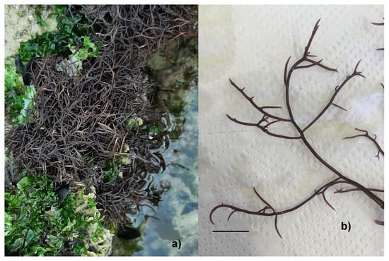 Chondracanthus acicularis specimens were captured: (a) in its natural habitat at Tamargueira beach in January 2024; (b) in the laboratory, highlighting the tip of the thallus (scale bar represents 0.5 cm).