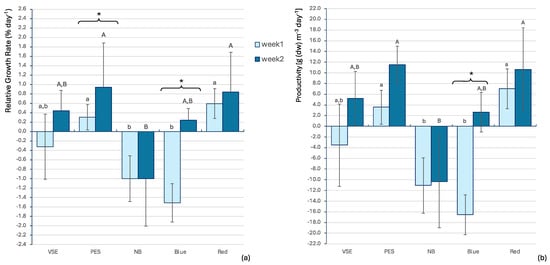 (a) Relative growth rate (RGR) and (b) productivity (Y) in the two-week trials of Chondracanthus acicularis. The bars represent the mean values and standard deviation (n = 3). VSE—Von Stoch Medium; PES—Provasoli Medium, NB—Nutribloom plus®, all grown with white LED light; blue—PES and blue LED light; red—PES and red LED light. Different letters above bars indicate significant differences (ANOVA, p-value < 0.05) between treatments, with lowercase letters for the first week and uppercase letters for the second week. An asterisk (*) above the bars indicates significant differences between weeks for each treatment.