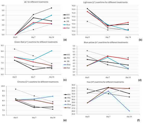 The CIELAB colour space consists of several components. The ΔE values show a noticeable colour difference over time, with increasing values (Figure 5a). The Kruskal–Wallis test delivered statistically significant differences between PES and NB (H(4) = 14.809, p-value = 0.005), with PES presenting the highest colour variation (5.51 ± 2.25) and NB the lowest (2.22 ± 0.60). The results indicate that all treatments show a slight darkening (decrease in L*), with values decreasing slightly over time, with no statistical differences (Figure 5b). A shift towards green (decrease in a*) can be noticed, except for the blue LED light treatment which shifts towards red (increase in a*) (Figure 5c). The statistical test with ANOVA indicates significant differences in a* (F(4, 40) = 4.767, p-value = 0.003), with the two NB and blue LED light treatments being significantly higher than VSE and PES.