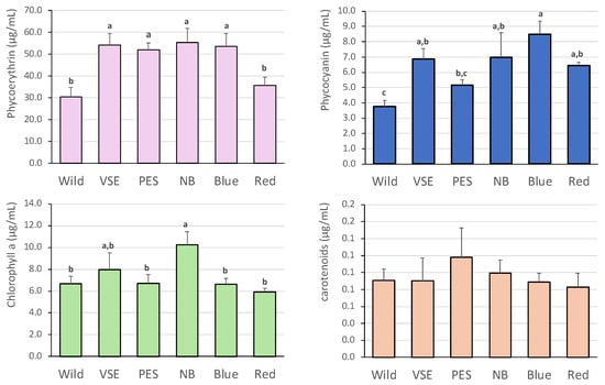 Pigment content of wild and cultivated Chondracanthus acicularis when grown over 14 days. VSE–Von Stoch Medium; PES–Provasoli Medium, NB–Nutribloom plus®, all grown with white LED light; blue–PES and blue LED light; red—PES and red LED light. The bars represent the mean values and standard deviations (n = 3). Different letters above bars indicate significant differences (ANOVA, p-value < 0.05) between treatments.