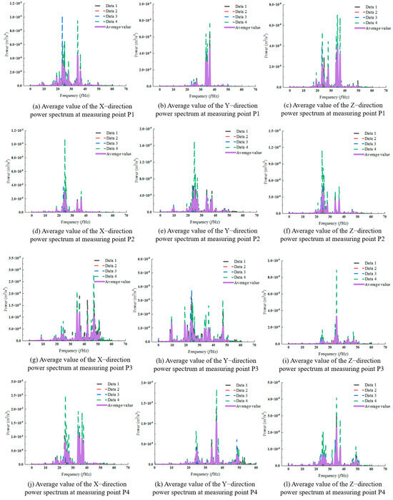 Figure 5 illustrates that the vibration frequencies at each measuring point predominantly fell within the 20–50 Hz range. Notably, the prominent frequencies across all directions were clustered around 25 Hz and 35 Hz.