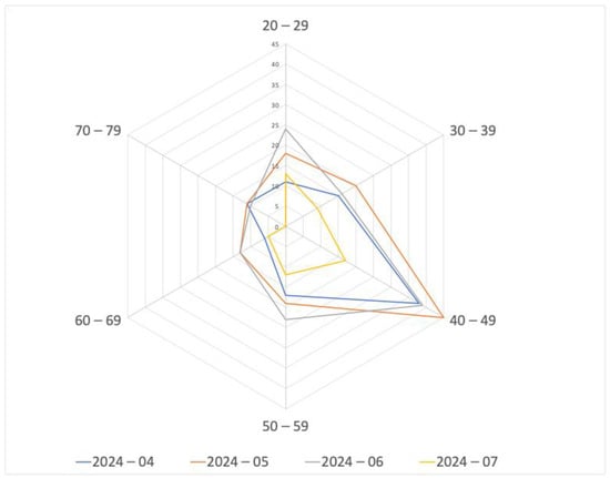 Figure 2 shows the presence of a peak in usage in May, particularly among the 30–39 and 40–49 age groups, followed by a gradual decrease in the following months. Younger and middle-aged groups (20–49) were the most active users of the CAPSULA pod, while older age groups (60–79) show limited engagement. The 40–49 age group had the highest average participation and significant variability, likely due to increased attention or a greater need for health monitoring in this range. In fact, visits to hospital EDs are usually serious for people in this age range that are usually healthy. The extreme age groups, such as 20–29 and 70–79, show lower and relatively stable participation, due to the following justifications: younger populations visit the ED mostly for traumatic issues that limit their mobility (bone or joint traumas), so visiting the CAPSULA service requires movement and patients can not or may not wish to move to reach the pod; elderly populations usually visit the ED for possibly severe pathologies (cardiovascular, neurological, etc.), so that they were classified as high-risk patients and quickly admitted for further evaluation.