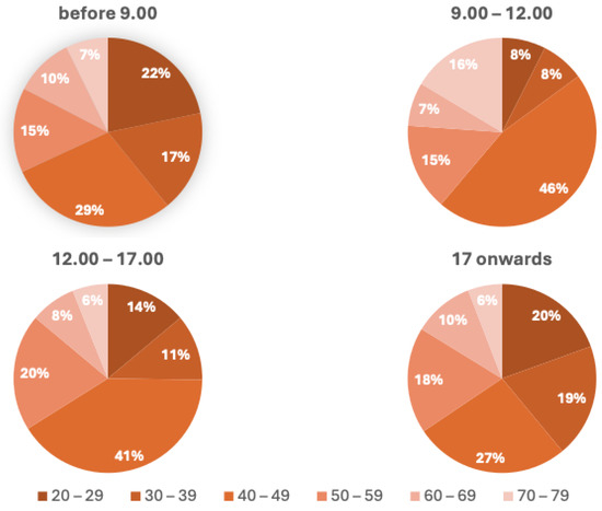Across all time intervals, there is a noticeable trend of higher CAPSULA usage among younger adults (particularly those in the 20–29 and 30–39 age brackets) and lower engagement from elderly patients. The highest percentage of users can be found in the 40–49 age group during the morning hours (before 9:00 and 9:00–12:00), highlighting that middle-aged individuals might find the system convenient for early-day visits. In the afternoon and evening (12:00–17:00 and 17:00 onwards), there is a slight shift, with some reduction in the younger age groups’ participation, while the 40–49 age group still forms a significant portion of users, even if slightly reduced.