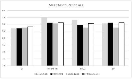 Mean values of test duration expressed in seconds for the four biosignals measured at different times of the day: before 9:00, 9:00–12:00, 12:00–17:00, and 17:00 onwards.