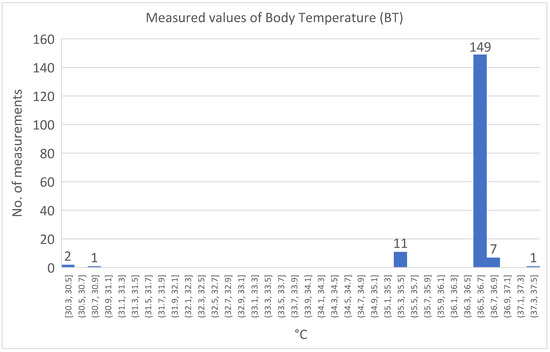 Figure 5 shows the very good reliability of the self-measurement of the body temperature, as expected due to the high familiarization of patients with this measure and related instruments. Indeed, three outliers (<1% of the total measurements) are present (measured body temperature between 30.3 °C and 30.9 °C); this is due to the poor positioning of the thermometer on the forehead at the correct distance, and therefore the lower environmental temperature of the air that is present between the body and the device. Also, the other eleven measurements (=2.72% of the total measurements) of body temperature in the range 35.3–35.5 °C are shown in the same Figure 5; the reason for the underestimation of the value is probably due to the too short time for the measurement (the subject removed the thermometer before the conclusion of the process, thus resulting in a lower measured temperature). These errors, accountable as procedural errors, were 3.46% of the total measurements. This value is very acceptable in the analyzed setting. However, this finding suggests the possible revision of the UI to improve the awareness of the subject about the process status and correct the positioning or the time needed by the thermometer to complete the right measurement.