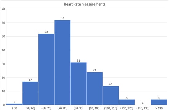 HR data were obtained both from pulse oximetry and the measurement of 1 ECG lead using the participants’ hands (Figure 7). The considered values were those computed by ECG. The HR value distribution is within normalcy ranges. A few “outliers” are present, including one value below 50 beats-per-minute (bpm), four values greater than 140 bpm in the high HR range, for a total of 5 out of 404 records (1.24%). Analyzing the tracks, these data are affected by poor signal quality with a high frequency content and low signal amplitude. This may be due to the poor contact (a very small portion of the hand surface, or a too strong pressure of the hands onto the electrodes with electrical activity of the arm muscles—in high frequencies—that is added to the ECG signal) between the hands and the electrode. The overall assessment of reliability is very good.