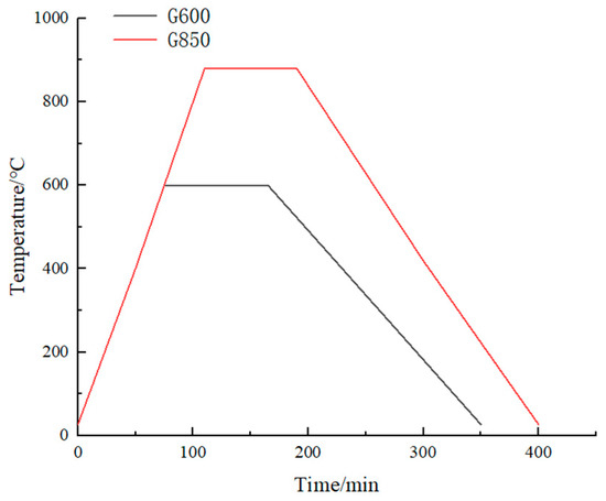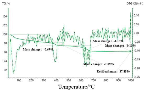 The coal gangue samples were sampled from Chenjiashan Coal Mine, Tongchuan City, Shaanxi Province, China, and their main mineral compositions, including mica, kaolinite, chlorite, quartz, and potassium feldspar, were measured by XRD whole-rock analysis, with contents of 23.7%, 23.2%, 23.7%, 27.1%, and 1.1%, respectively (Table 2). By thermogravimetric analysis (TG), the residual mass of gangue was 87.88% at 1000 °C, and the DTG curve showed an inflection point at 450 °C (Figure 1). The collected coal gangue was crushed and sieved to reduce the fraction size to less than 4 mm. Afterward, the coal gangue fractions were moved to a rotary high-temperature sintering furnace for calcination at 600 °C and 850 °C and cooled to the ambient temperature in air. Then, the obtained calcined coal gangue was put into the ball mill for 10 min of grinding, and finally the loose texture of the TACG silt. The variation of heating/cooling curves during gangue calcination is shown in Figure 2.