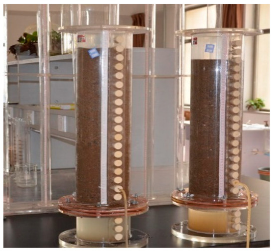 The coal gangue and TACG-modified sandy soils were filled into the mold for water-holding capacity evaluation. Moreover, 500 g of soil samples were weighed and poured into the glass column to prepare a soil column for the test. Then, a peristaltic pump was applied to inject tap water (to avoid the flow rate being too fast in the upper layer of the stagnant water, after several tests, the flow rate was set to 0.69 mL/s) from the top layer of gauze. The injection of water was stopped when the seepage occurred. Afterward, the duration to reach the seepage was recorded. The experimental soil needs to be dried at 105 °C before testing.
