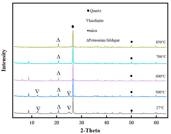 Through the XRD characterization test of the TACG subjected to different calcination temperatures (Figure 4). It can be observed that the samples still exhibited sharp diffraction peaks of kaolinite when calcined at a temperature lower than 600 °C. When calcined at a temperature of more than 600 °C or more, the intensity of the kaolinite peaks in the activated gangue decreases until it disappears, and at this time, the crystalline lattice of the mineral particles is destroyed by the continuous energy input, presenting an amorphous structure. This observation is in agreement with the previous studies that the bound water in kaolinite can be lost due to the thermal impact, and the crystal was destroyed [17].