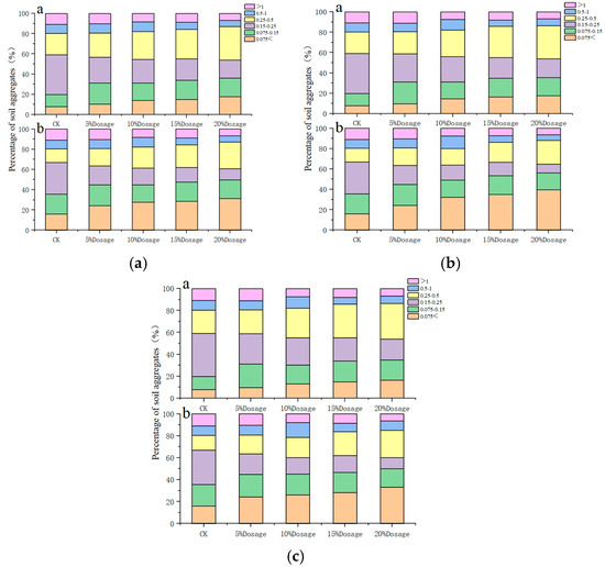 (a) Raw coal gangue effect on soil aggregate composition (a: dry sieve method, b: wet sieve method); (b) 600 °C gangue effect on soil aggregate composition (a: dry sieve method, b: wet sieve method); and (c) 850 °C gangue effect on soil aggregate composition (a: dry sieve method, b: wet sieve method).