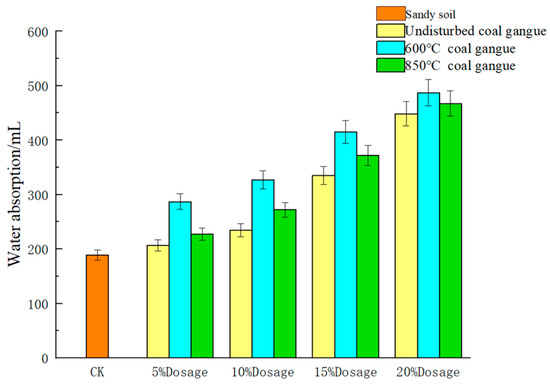 Comparing the water absorption of mixed soil with 20% of different calcined coal gangue. For example, the application of 600 °C calcined coal gangue in sandy soil resulted in water absorption of 472 mL, which was increased by 148.8% compared to CK. At the same time, 850 °C calcined coal gangue-modified sandy soil contributed to the water absorption of 464 mL, which was increased by 143.8% compared to CK. On the other hand, the calcination treatment also improves the performance of coal gangue in mixed sandy soil during the water evaporation test. Moreover, 20% of raw coal gangue mixed with sandy soil exhibited a water content of 40.1% and 9.8% after 12 h and 24 h, respectively. Meanwhile, the sample mixed with 600 °C calcined coal gangue reached a water content of 44% and 13% after 12 h and 24 h, respectively. However, the increased calcination temperature of coal gangue showed a limited improvement in water-holding capacity. Mixed sandy soil with 850 °C calcined coal gangue exhibited a water content of 41.8% after 12 h and 11.6% after 24 h, which were lower compared to samples mixed with 600 °C calcined coal gangue particles. These observations indicate that calcination pre-treatment of coal gangue can effectively promote the water retention capacity of mixed sandy soil. By testing both water holding and retention, a more complete picture of the effect of gangue material application on soil properties can be seen. Morover, it can be seen that the resulting effect is a combination of both the amount of material incorporated and the treatment temperature. Combining the results of the two tests, when the gangue material mixing amount is 20% and the treatment temperature is 600 °C, the most excellent enhancement of the performance of sandy soil. To further confirm the water absorption ability of calcined coal gangue mixed sandy soil, the isothermal water absorption was conducted and will be discussed in the following section.