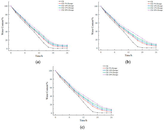 (a) Changes in water content of mixed soils modified with raw coal gangue. (b) Changes in water content of mixed soil modified with coal gangue calcined at 600 °C. (c) Changes in water content of mixed soil modified with coal gangue calcined at 850 °C.