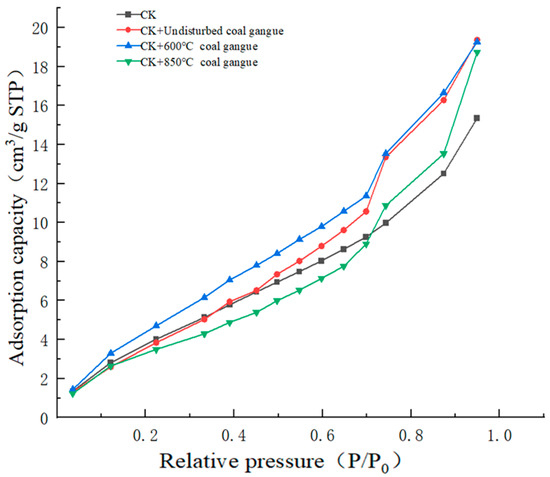 The water vapor adsorption curves of sandy soil modified by coal gangue or calcined coal gangue are shown in Figure 8. It is clear to see that the adsorption curves exhibit a character of type II [22]. The adsorption behavior of water molecules on the particles of mixed sandy soil can be divided into three stages: monolayer adsorption, multilayer adsorption, and capillary condensation [23]. It can be seen that the relative pressures corresponding to the two bending regions of the curve are 0.1–0.7 and 0.7–0.9, respectively. The results show that the water vapor adsorption capacity of the coal gangue and calcined coal gangue mixed sandy soil was enhanced compared to CK. For example, when the relative pressure reaches 0.8, CK reaches a water adsorption capacity of 10 cm3/g, while CK+ 600 °C calcined coal gangue shows a capacity of 14 cm3/g, and CK + 850 °C calcined coal gangue reaches 12 cm3/g. This indicates that under the high relative humidity, the application of coal gangue and calcined coal gangue all promoted the water adsorption ability of sandy soil. However, the low environmental RH is most often presented in practical situations.