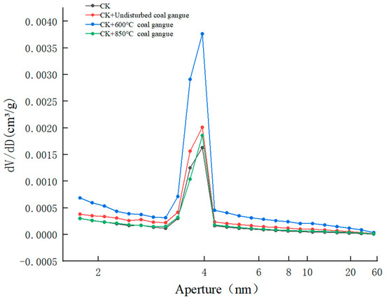 According to the results of the nitrogen adsorption–desorption curves of the mixed sandy soil under different treatments, the pore distribution curves of the mixed sandy soil samples under various treatment conditions can be obtained by using the BJH theory [24]. As can be seen in Figure 9, the pore size distribution of sandy soil was modified after mixing with coal gangue and calcined coal gangue. The pore volume around 4 nm was significantly increased after the incorporation of coal gangue and calcined coal gangue. CK + 600 °C exhibited the highest pore volume, around 4 nm, which provided more pores for water adsorption during the isothermal water adsorption test under relatively low P/P0. In other words, the presence of these small pores contributed to the water capture ability at low relative humidity. This will be helpful for the water retention of sandy soil. It is clear to see that the calcination temperature shows obvious effects on the pore structure of the calcined coal gangue. The high-temperature (850 °C) calcination reduced the small pores in coal gangue particles, as well as the water retention ability of the corresponding mixed sandy soil. This further indicates that the application of coal gangue and calcined coal gangue changed the original pore distribution structure of the sandy soil and improved the adsorption capacity of the mixed sandy soil. TACG (600 °C) exhibited the best performance on the nano-pore volume enhancement, which resulted in the best performance of water adsorption under low relative humidity. This property will be helpful to the re-cultivation of sandy soil under a water-scarce environment.