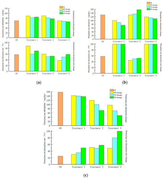 (a) Changes in NH4+ adsorption/desorption under different treatments. (b) Changes in PO43− adsorption/desorption under different treatments. (c) Changes in K+ adsorption/desorption under different treatments.