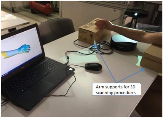 In this research, the scanning was performed using the EinScan-SE 3D Scanner by Shining 3D® Tech Co., Hangzhou, China []. During the scanning process, the hand was positioned neutrally, aligned at  relative to the two motion axes, with the fingers in a relaxed state resembling the grip on a glass (see Figure 1). This posture facilitated the capture of data in the less visible regions, primarily located between the fingers. The result of each scanned surface, from the whole anatomy of the studied hand, was visible in real time during the scanning process. It is important to note that for optimal connection of the individual scanned surfaces of the hand to create the final model of the hand, the design of some “guide” points on it was manually performed, as they were quite distinct from the 3D scanner. The hand remained stationary during the process of scanning each surface, and was then moved in such a way as to obtain data from the remaining parts of the anatomy as necessary. Stabilization of the arm is deemed necessary in order to obtain a good digital model representation of the actual anatomy. For this reason, the use of some supports (Figure 1) was deemed necessary after the first scanning tests, as after the first minutes of the procedure, it was difficult to control the position of the arm, as well as to keep it stationary. The whole process took about 15 min after the first tests were carried out, mainly due to the inability to completely immobilize the hand and the great complexity of the surface to be scanned.