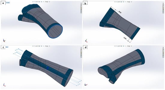 Parametric design of the wrist splint model. (a) Incision at both ends (forearm and fingers), (b) designing splines at a distance of 15 mm on the forearm side and 30 mm on the finger side, (c) creation of a plane along the model and splines at a distance of 7.5 mm from the middle plane and (d) final model of customized wrist splint based on which the TO problem is solved.